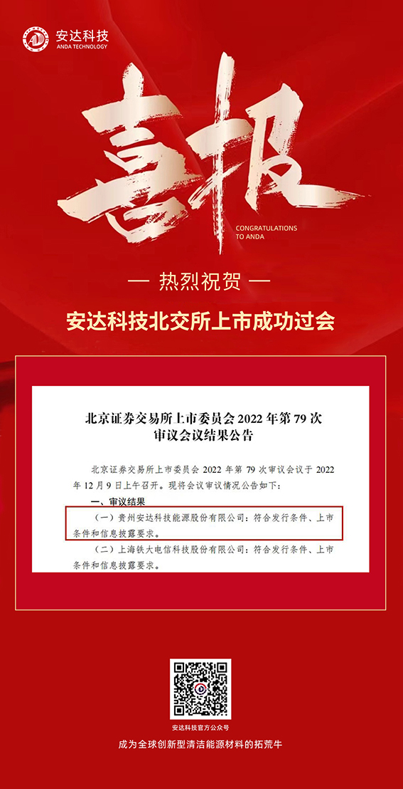 近日,北京證券交易所上市委員會(huì)2022年第79次審議會(huì)議結(jié)果公告顯示:貴州安達(dá)科技能源股份有限公司(以下簡(jiǎn)稱“安達(dá)科技”、“公司”)(830809.NQ)符合發(fā)行條件、上市條件和披露要求,成功過(guò)會(huì)。
